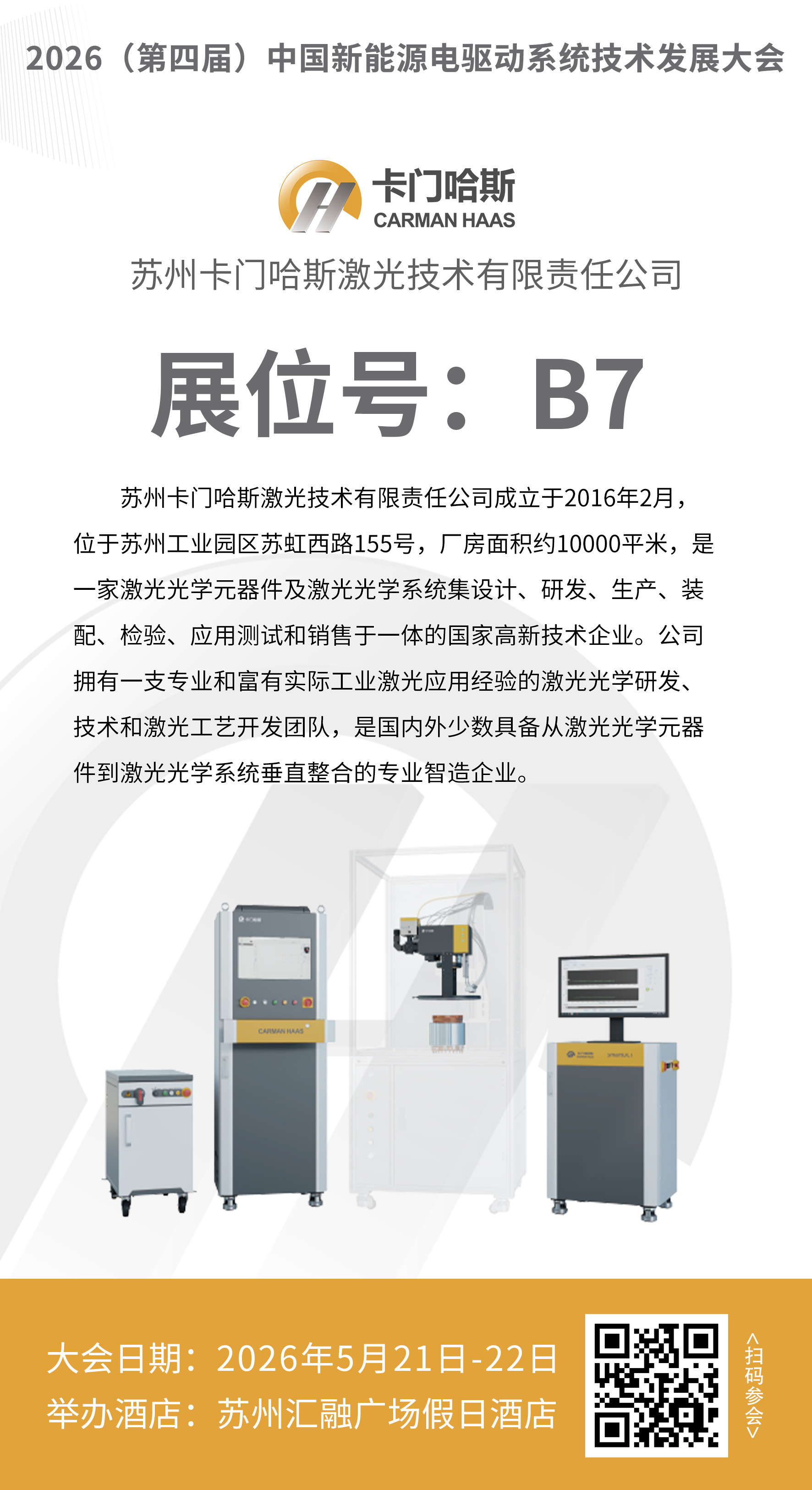 苏州卡门哈斯激光技术有限责任公司是“2026(第四届)中国新能源电驱动系统技术发展大会”的赞助商,将被作为VIP嘉宾受邀出席大会。届时,将在大会上与数百名行业头部企业的高管和工程技术人员会面,通过展台,展示该企业最核心、最前沿的产品技术,建立高端、有效的商务合作关系。