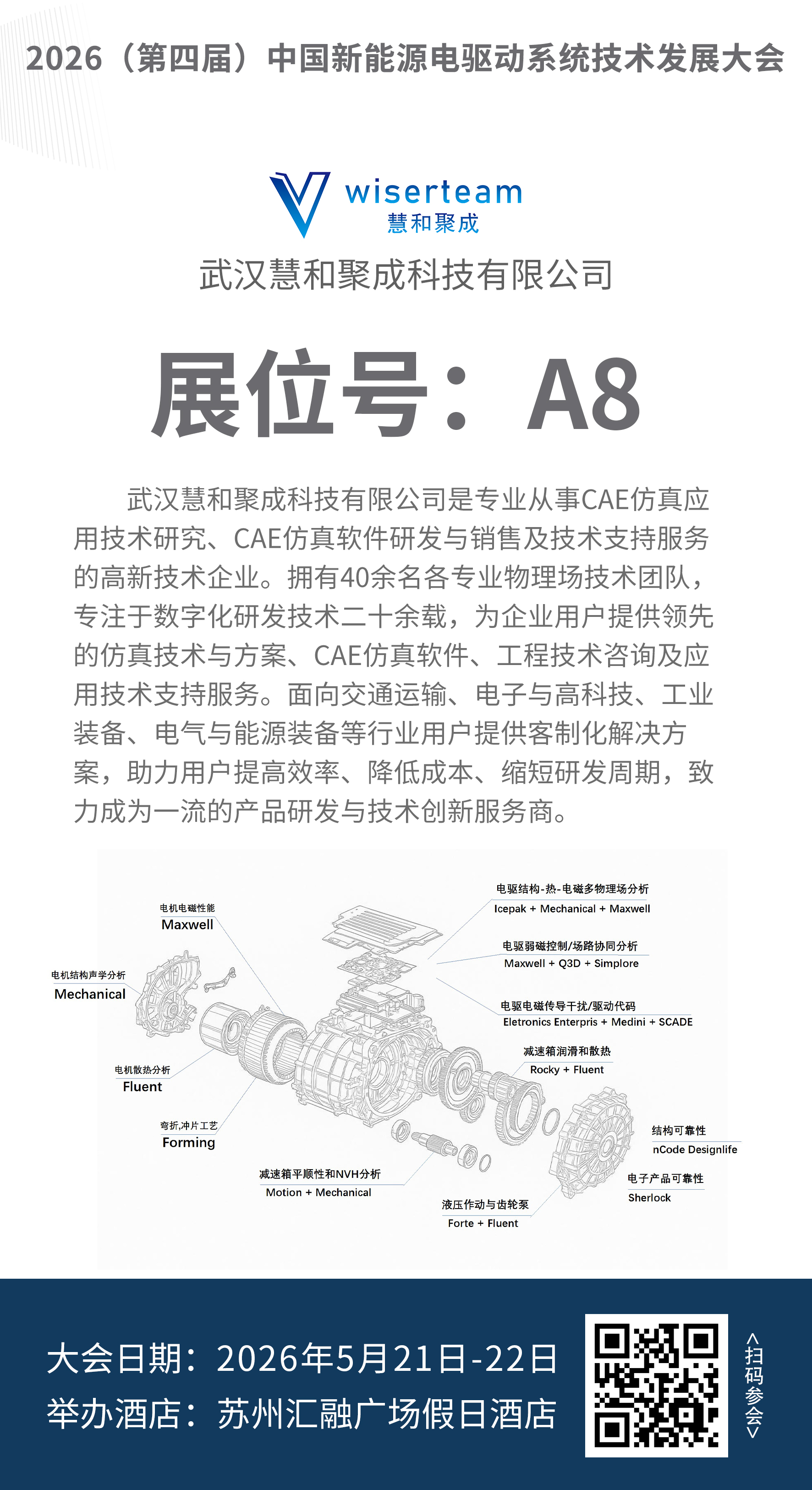 武汉慧和聚成科技有限公司是“2026(第四届)中国新能源电驱动系统技术发展大会”的赞助商,将被作为VIP嘉宾受邀出席大会。届时,将在大会上与数百名行业头部企业的高管和工程技术人员会面,通过展台和演讲,展示该企业最核心、最前沿的产品技术,建立高端、有效的商务合作关系。
